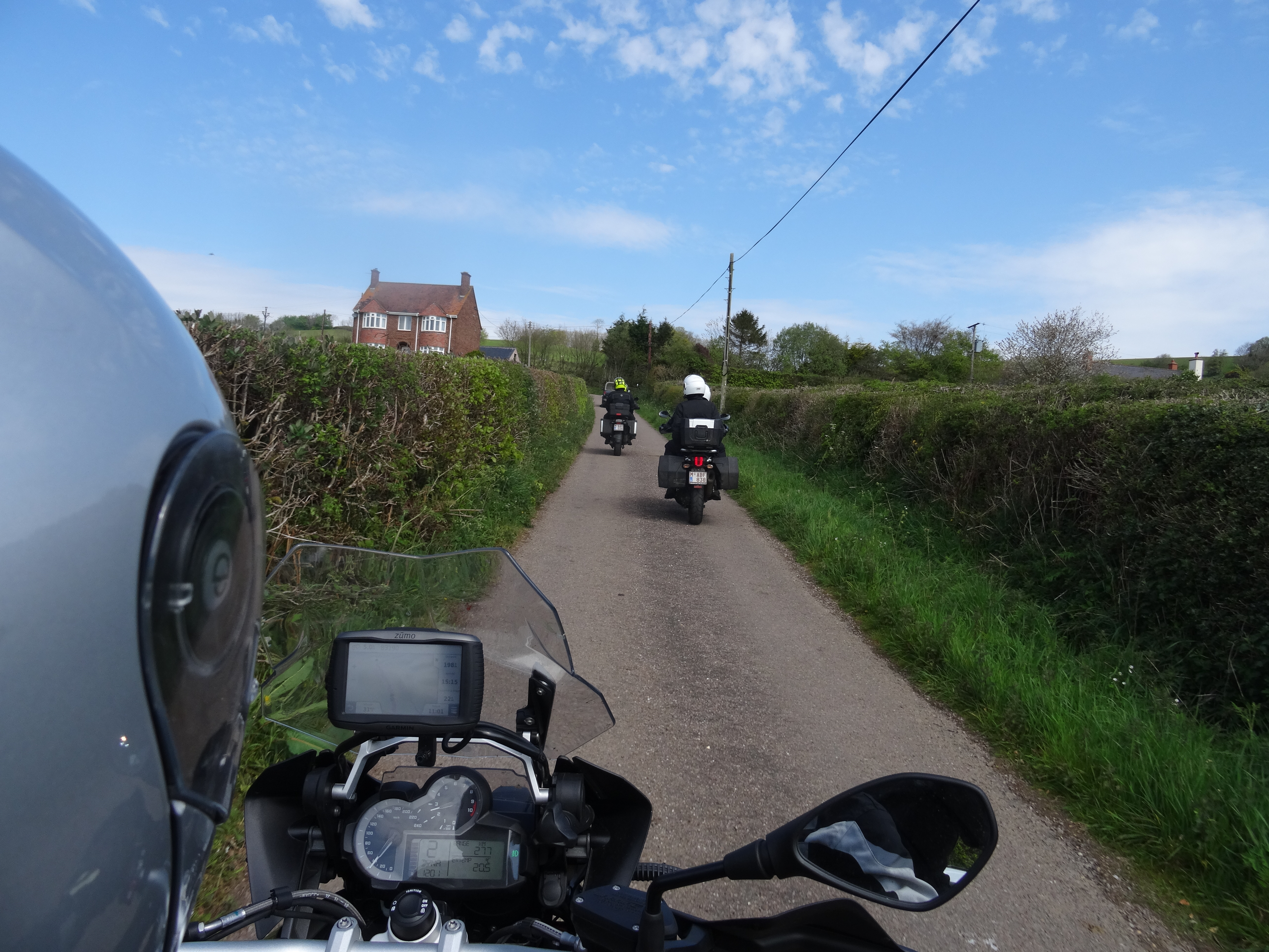 Avant le départ, une photo avec un panneau BMW, et oui, si peu de chose pour égayer certains visages 😉 . Du coup ils ouvrent la route.. Premier rond point, découverte d’une industrie de recyclage, zut ! c’était le suivant. La route continue, on s’éloigne.., on prendra une loppet corner par un sous-bois tapissé de milliers de jacinthe des bois ! Merci le détour ! C’est magique, au printemps, les sous-bois de hêtres encore bien éclairés d’un tapis bleu intense au parfum capiteux dans le sud de l’Angleterre (notamment en traversant la Lymingue Forest). Toujours de belles routes étroites avec ses hautes haies.