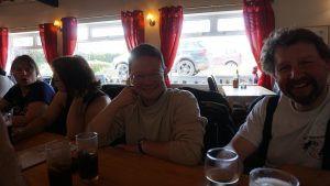 Après avoir sillonné de jolies petites routes, nous voilà au 1er hôtel « Woolpack Inn« , avec son Parking privé pour BMW ; excusez-les, ils leurs faut certainement plus de place que les autres pour se garer 😉 Ce soir, au menu, une « Carling » spéciale pour Carl, et un Hot Dog avec un steak de boeuf énorme et des frites de carottes pour Klaus 🙂 …